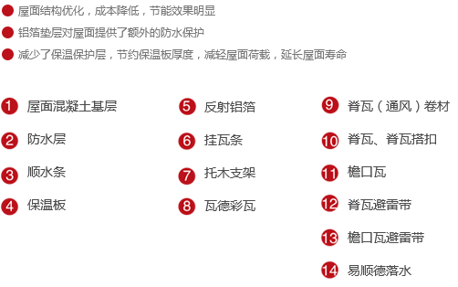作為傳統(tǒng)屋面通風(fēng)方案的優(yōu)化,鋁箔墊層的加入,使反射鋁箔與嵌入順?biāo)畻l間的保溫板形成空氣間層,代替了部分保溫板厚度,而且省去了保溫保護層。